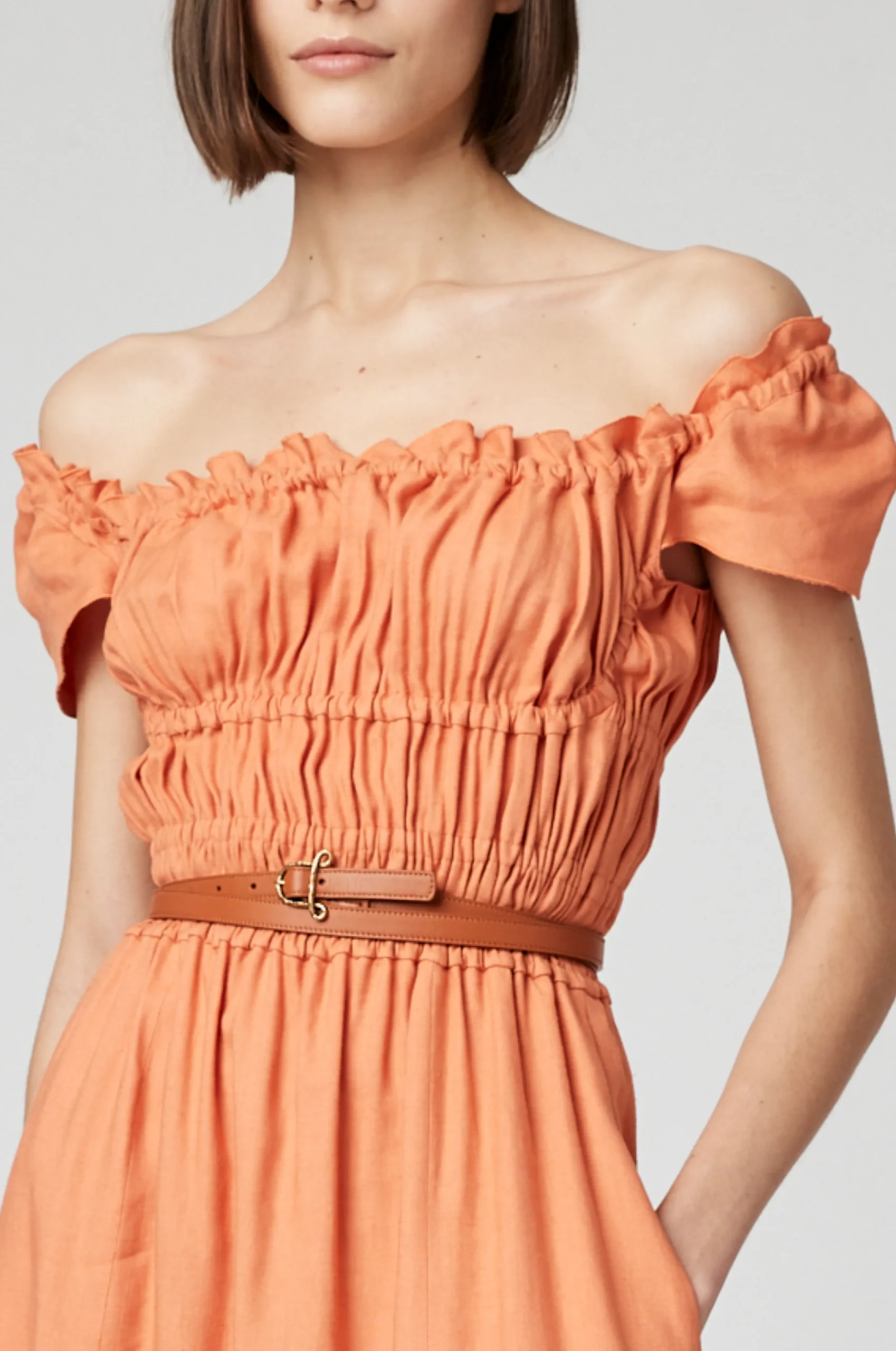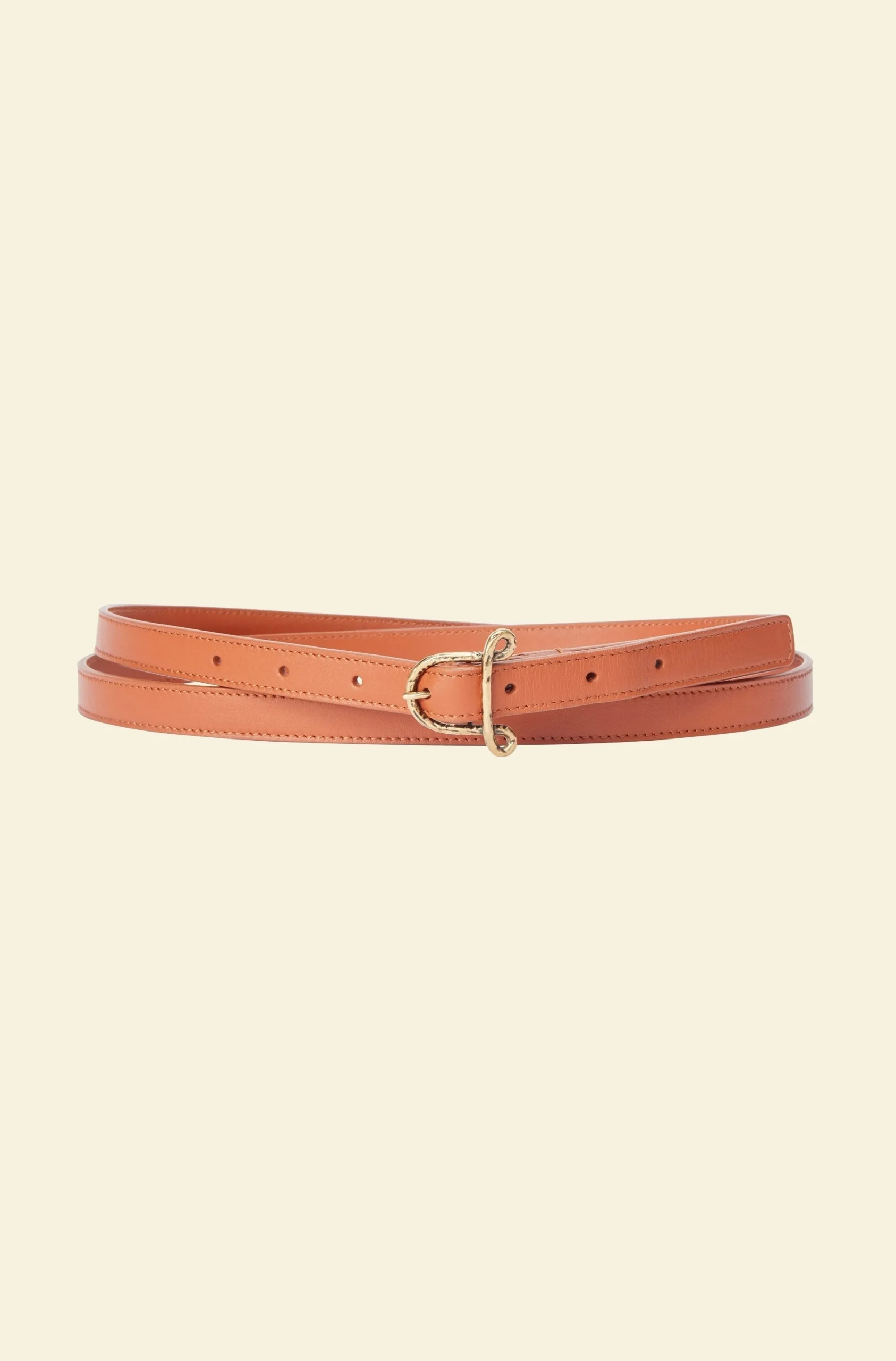 The Small ‘A’ Belt is crafted in smooth tan leather with tonal topstitching. Features an abstract A-shaped buckle in textured gold-tone metal at the center-front.