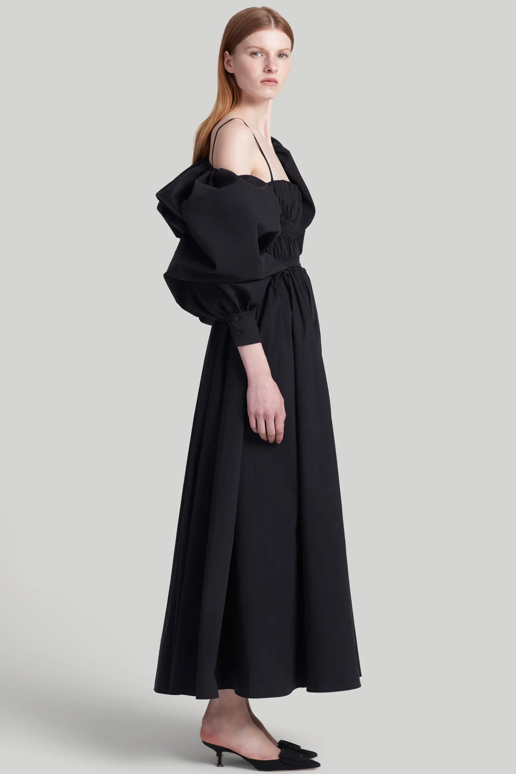 The ‘Andrea’ dress first walked down the SS24 runway where generous trapeze styles were inspired by fifties and sixties couture. It’s designed with detachable voluminous puff sleeves that effortlessly drape off the shoulders then balanced by a slim-fitting ruched bodice.