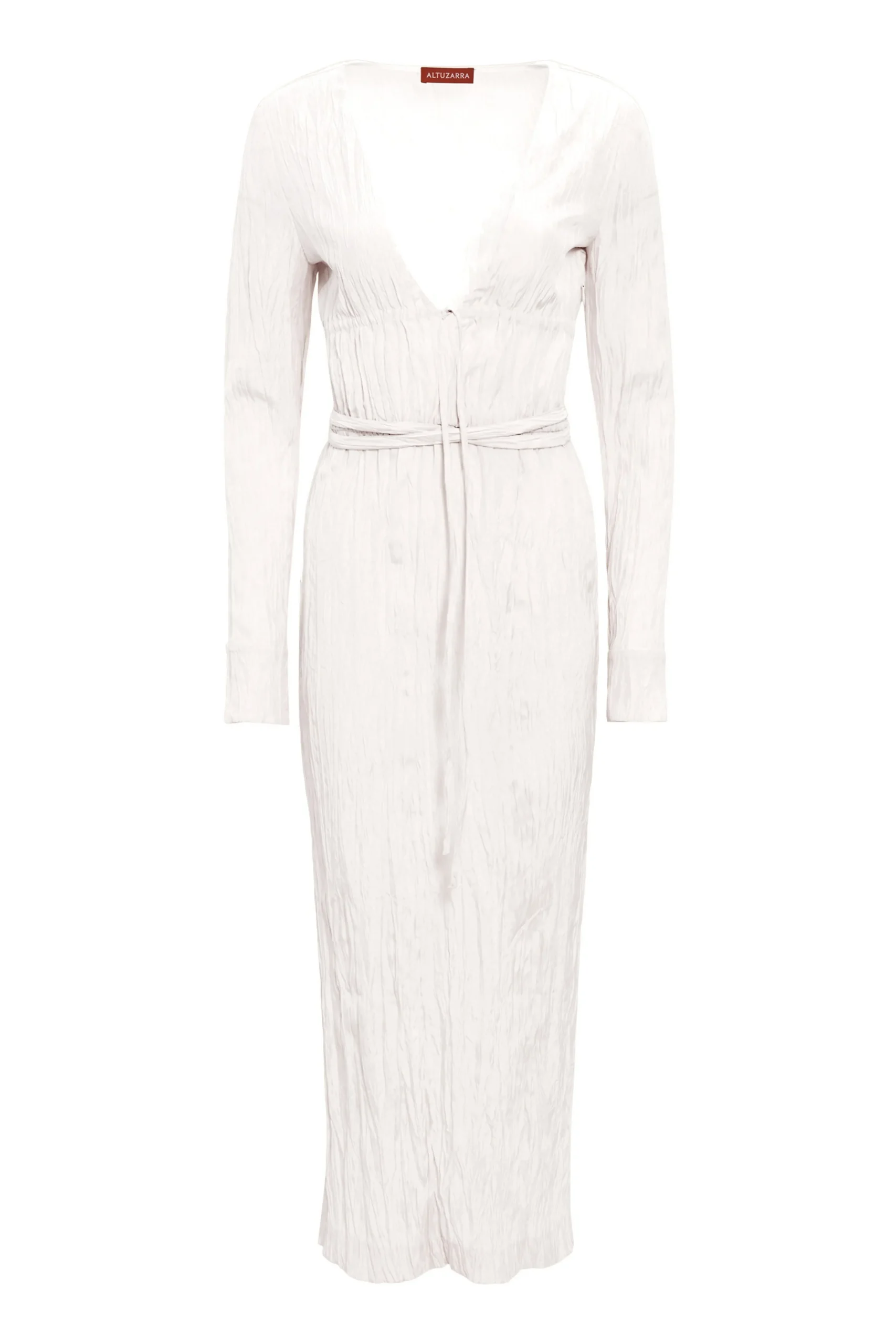 The ‘Carol’ dress is a flattering midi-length design with a low V-neck tempered by a slim tie fastening. The crinkled fabric expertly shapes the body while the wraparound belt cinches the waist.