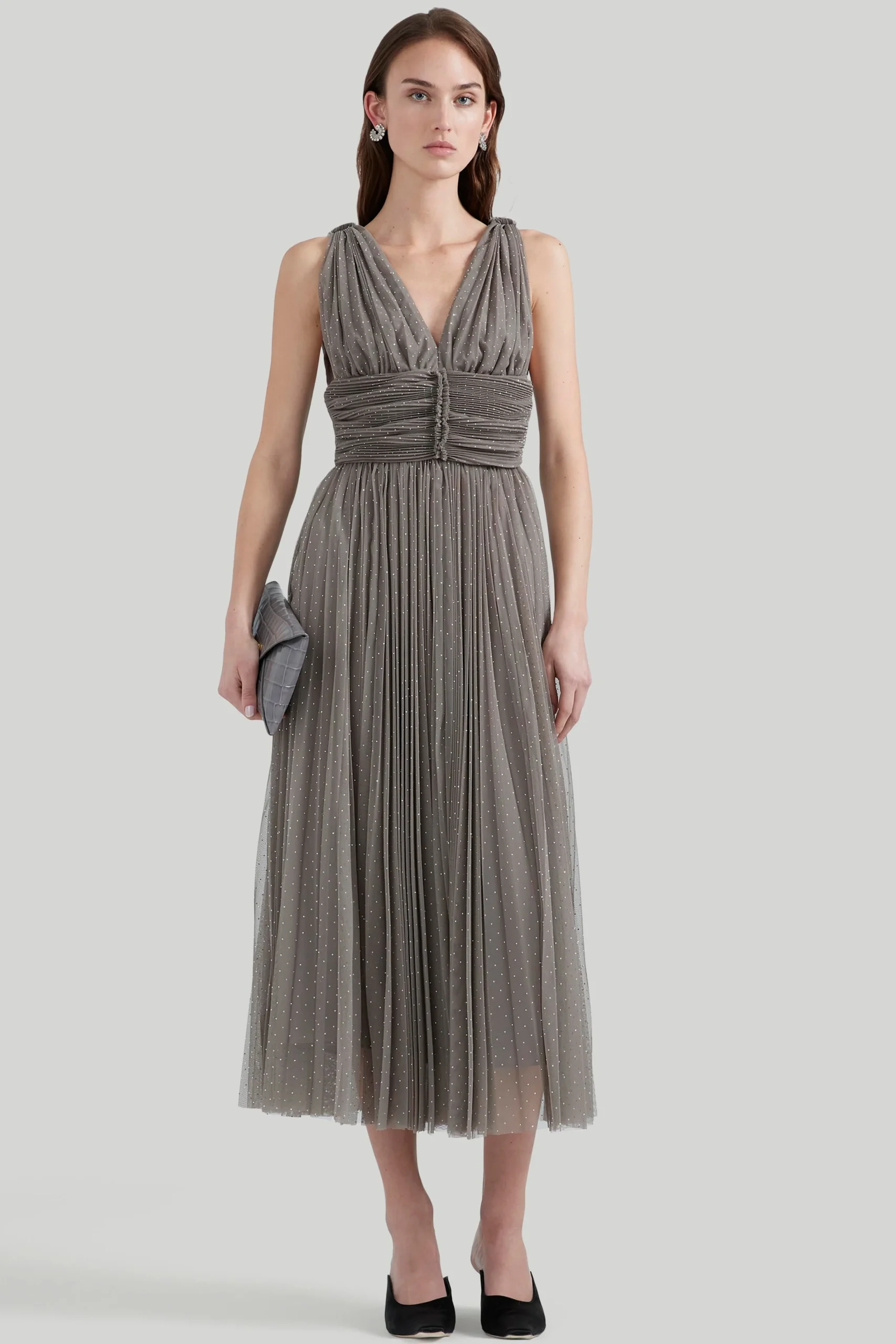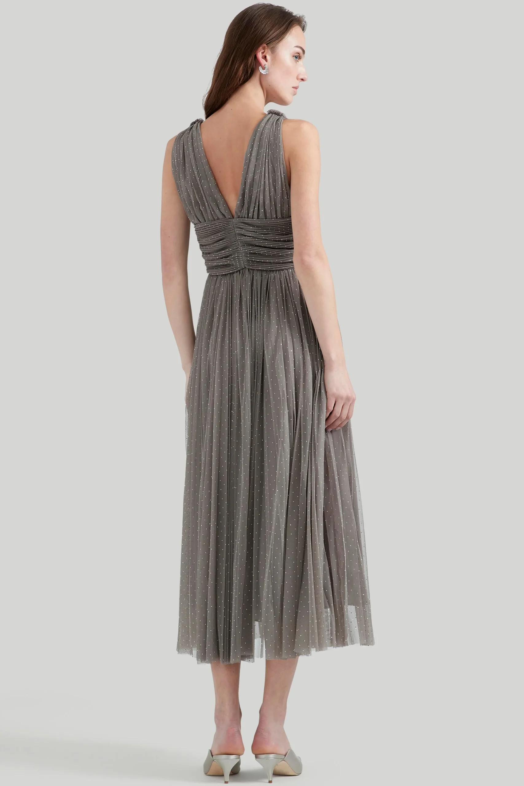 The ‘Lola’ dress is the epitome of modern femininity. It’s shaped in Italy from sheer polka-dot tulle with a low cut V-neck and a banded waist that falls to a maxi hemline.