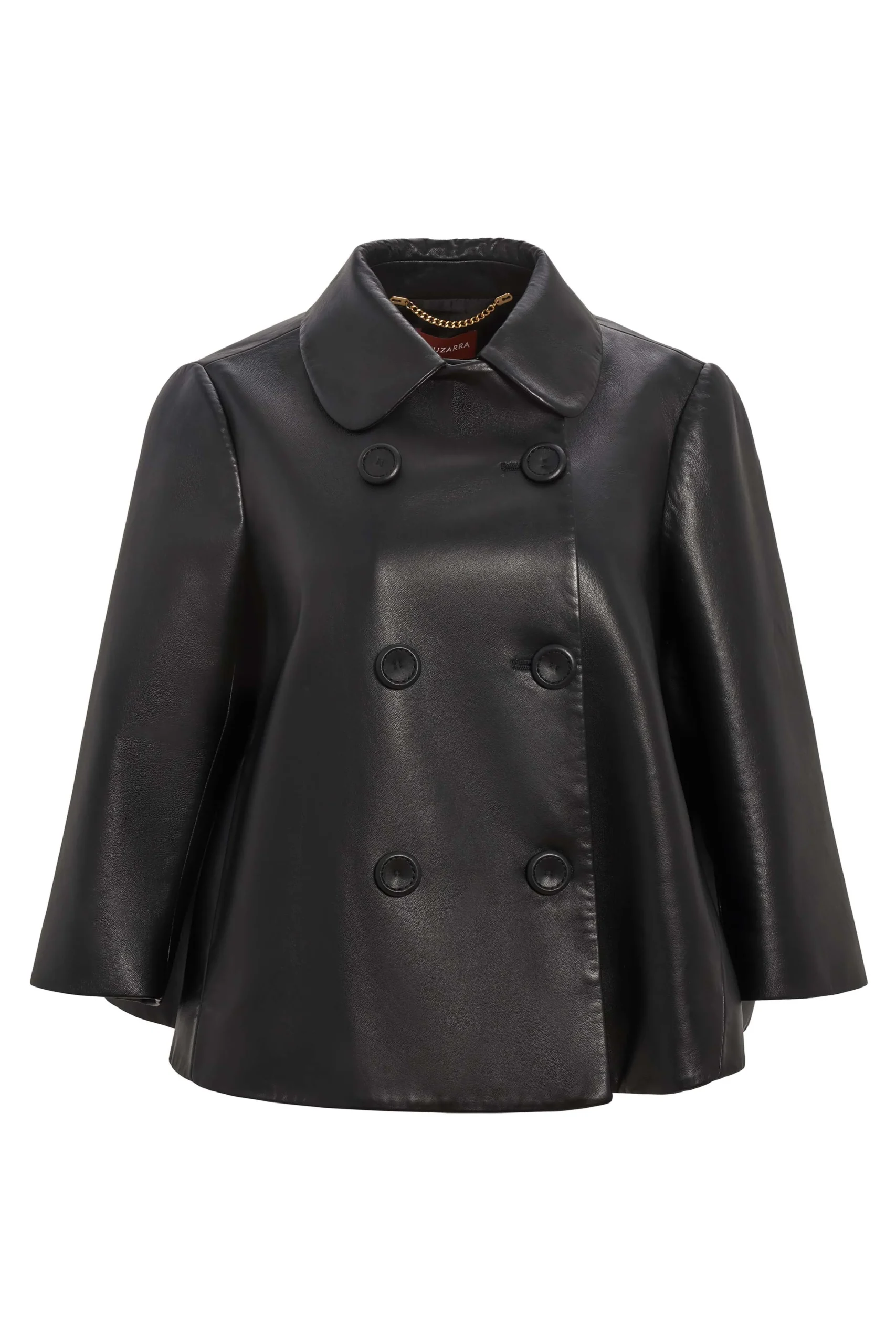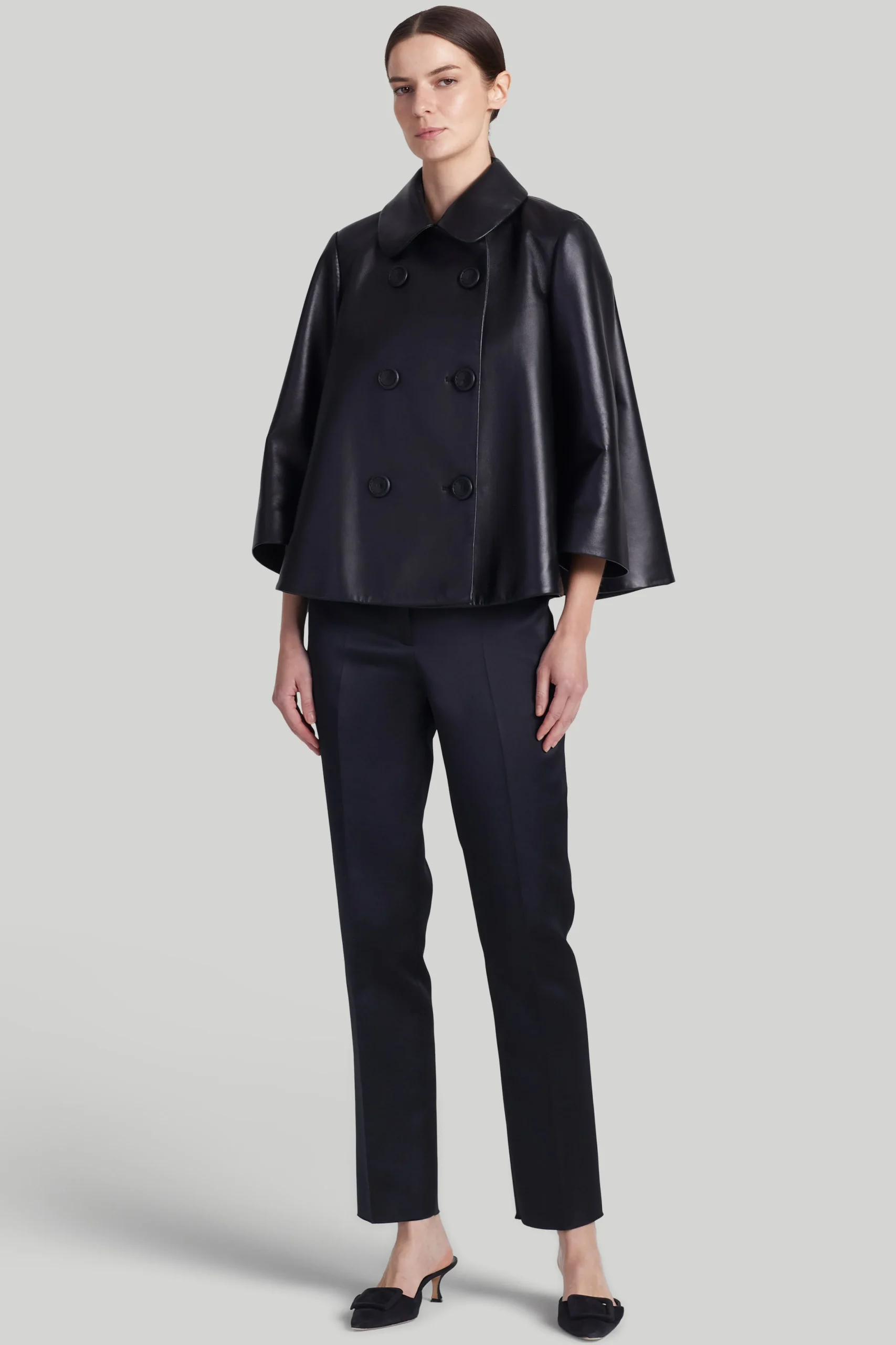 The ‘Hayden’ Jacket featured in Altuzarra’s SS24 runway show which drew inspiration from the timeless horror movie ‘Rosemary’s Baby’. It’s shaped from lamb’s leather to a voluminous silhouette with a point collar and a double-breasted button front.