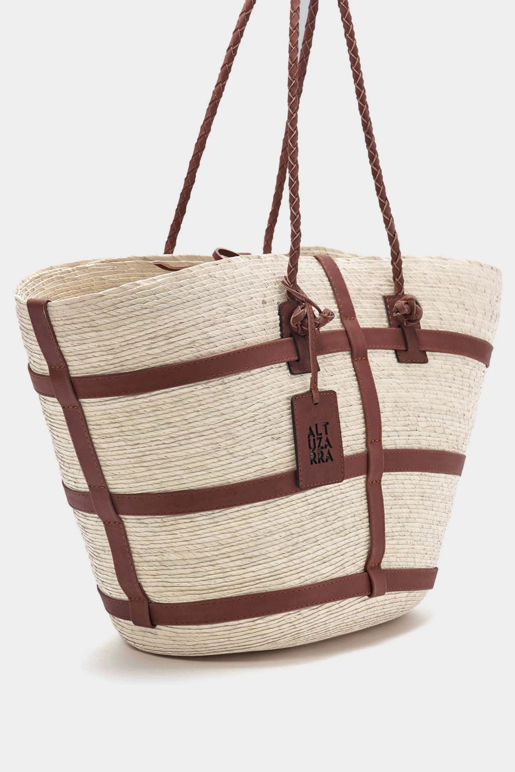The ‘Watermill’ Bag Large is woven from natural palm leaf to a spacious silhouette. Features brown leather trims with hand-stitched detailing and slim braided top handles. A laser-cut logo tag completes the design.
