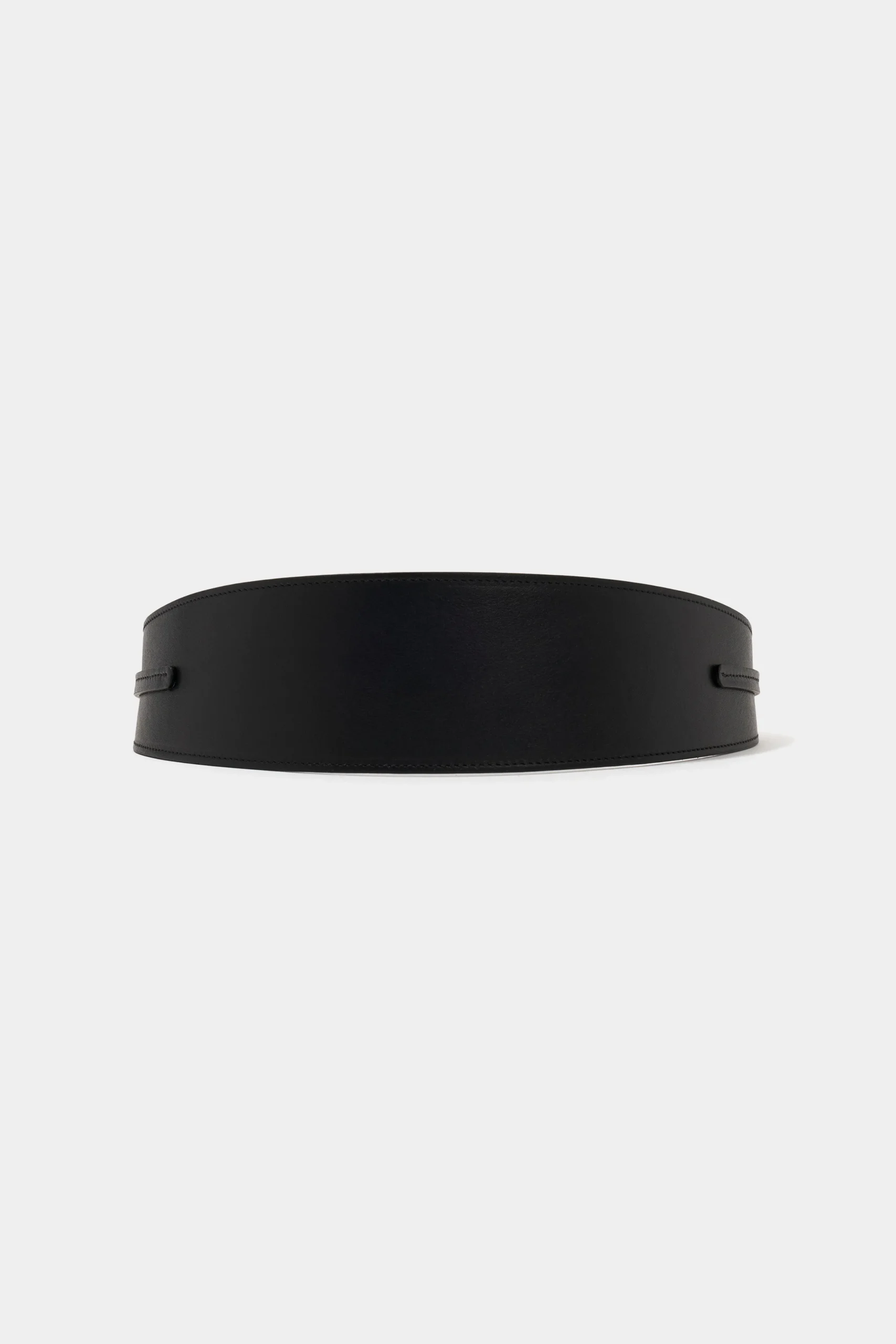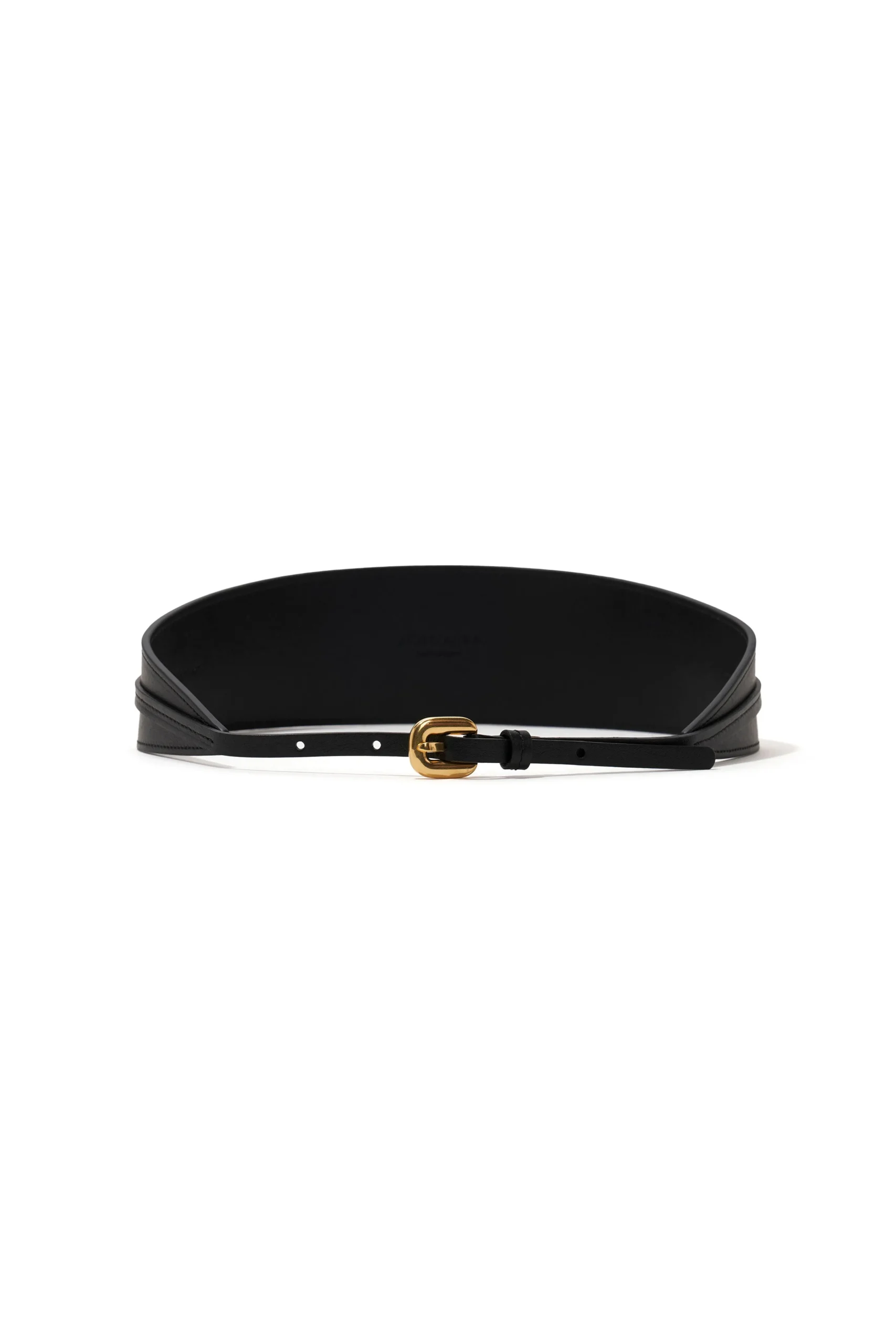 This wide belt is made in Italy from smooth calf leather. Note how it’s shaped with a wider back and a slim front, then finished with a gold metal buckle.