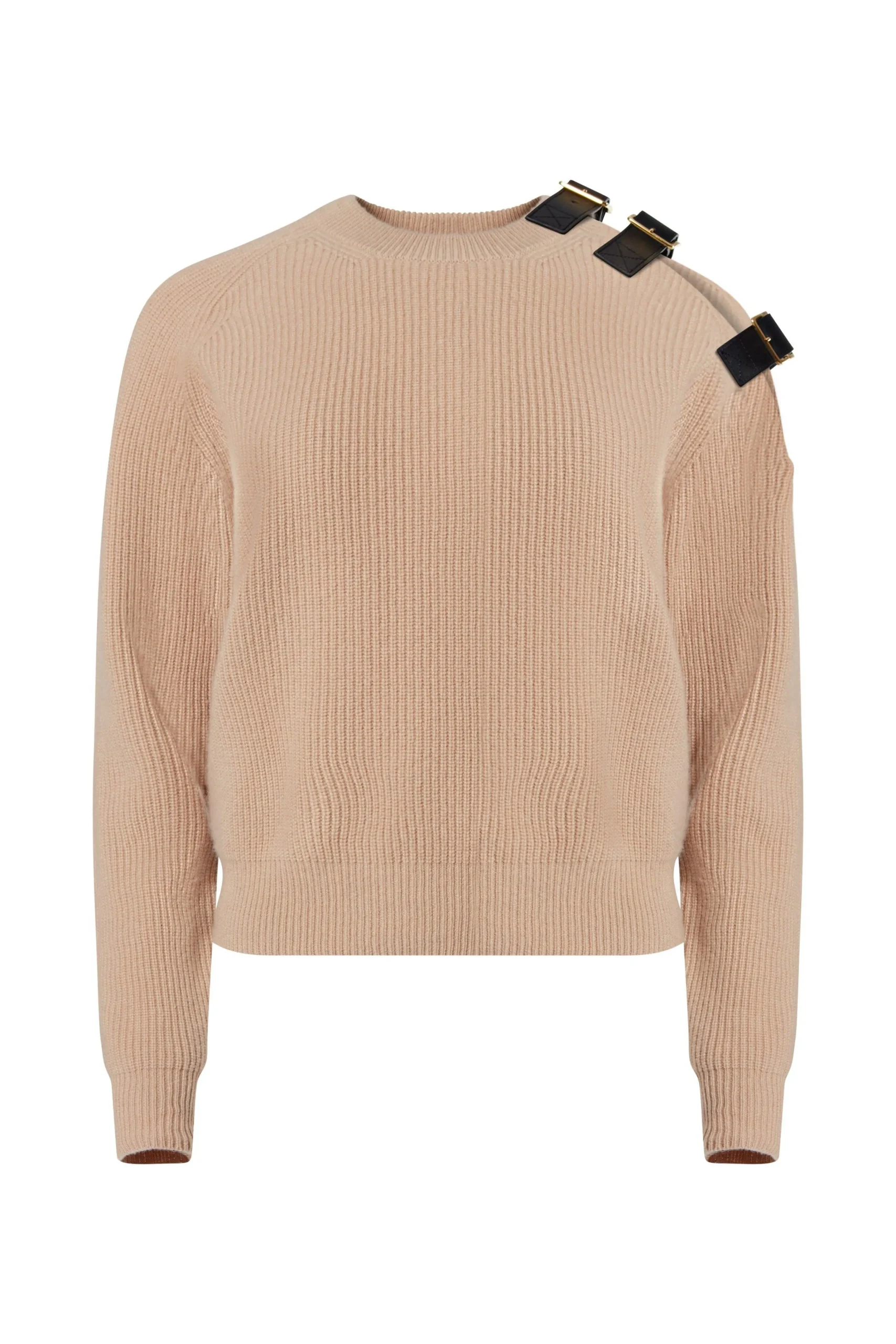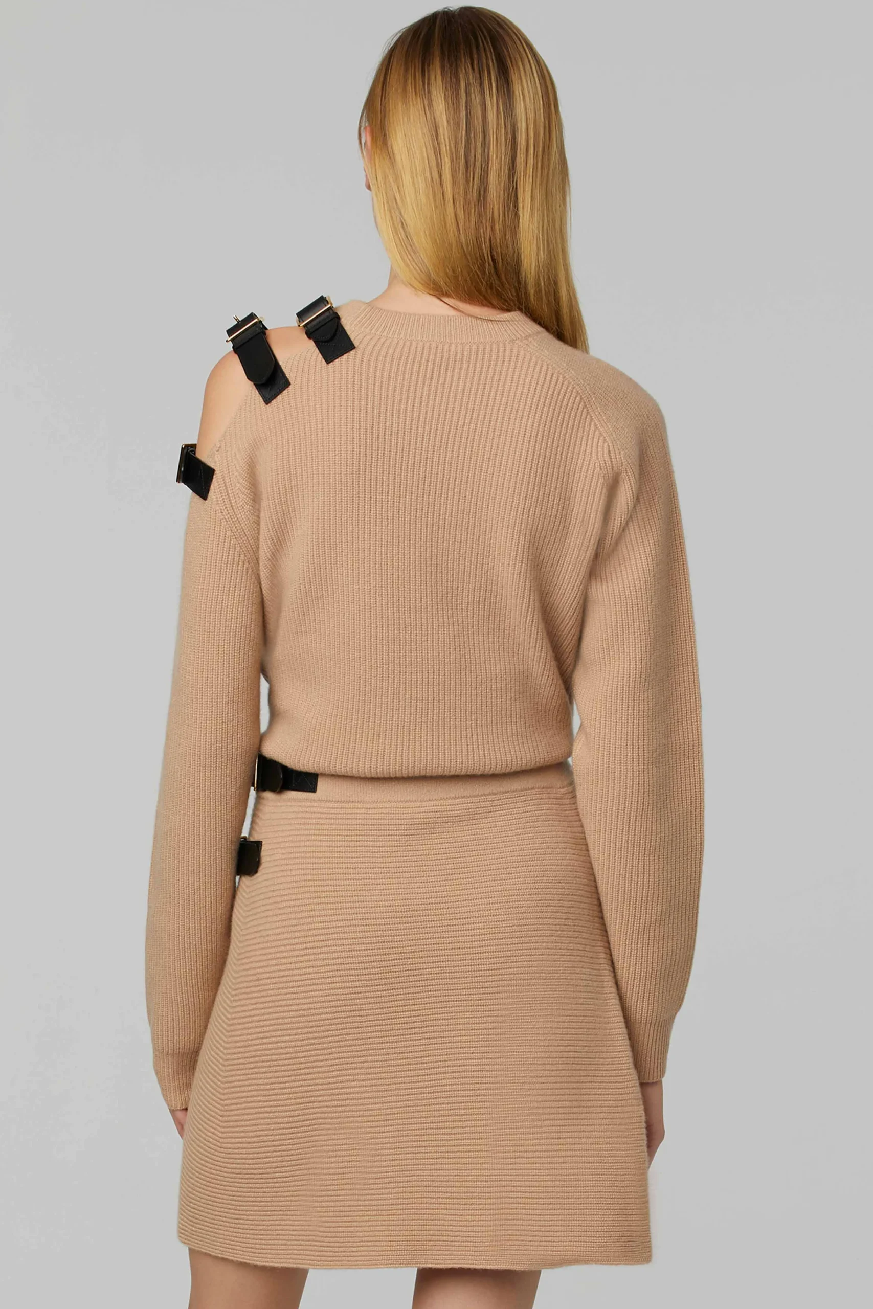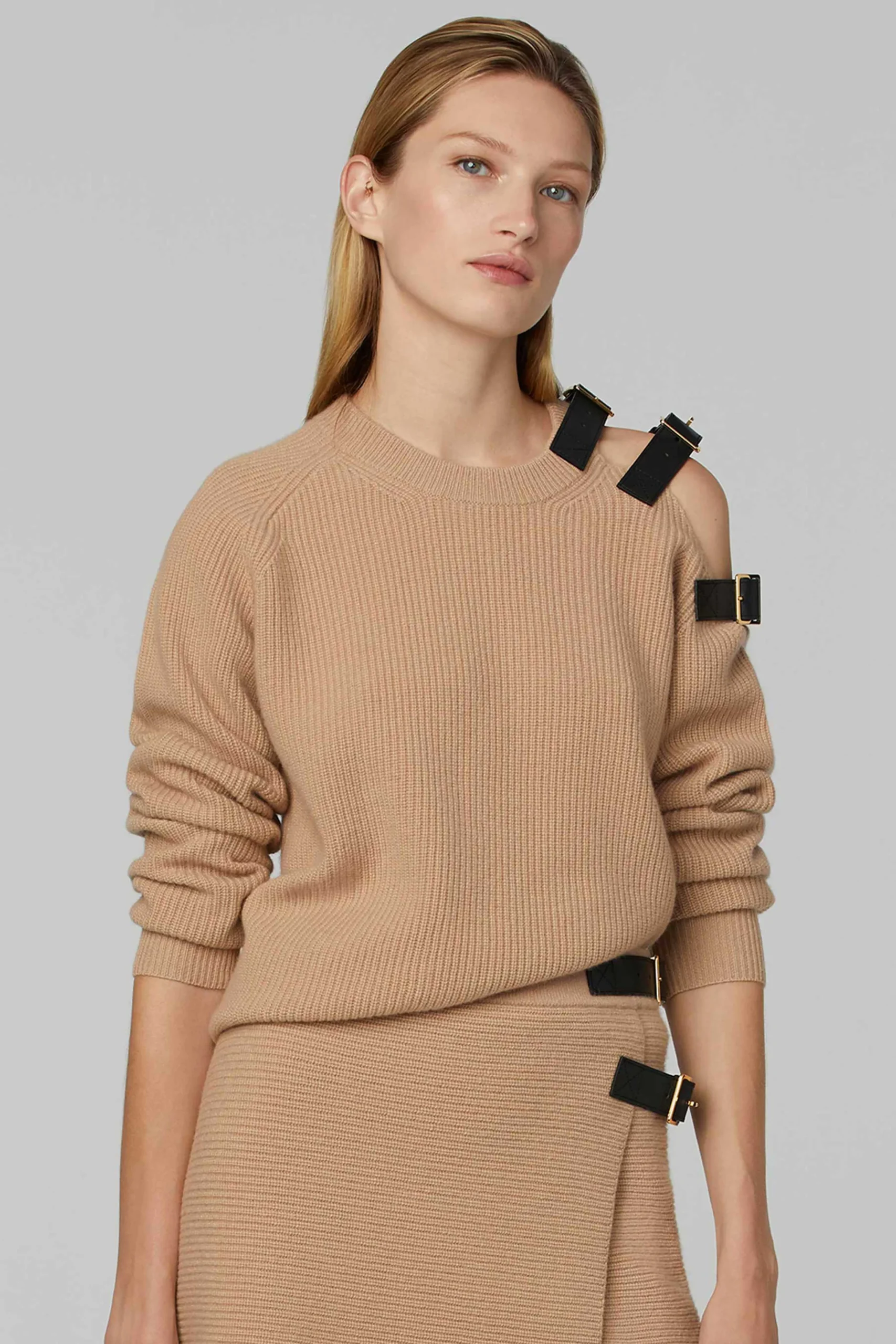 The ‘Ness’ sweater is ribbed-knit from an irresistible blend of merino wool and cashmere in a slightly oversized silhouette. In stark contrast to its softness, a row of metal buckle straps—a signature detailing of the PLAY family—adorn the garment’s cold shoulder.