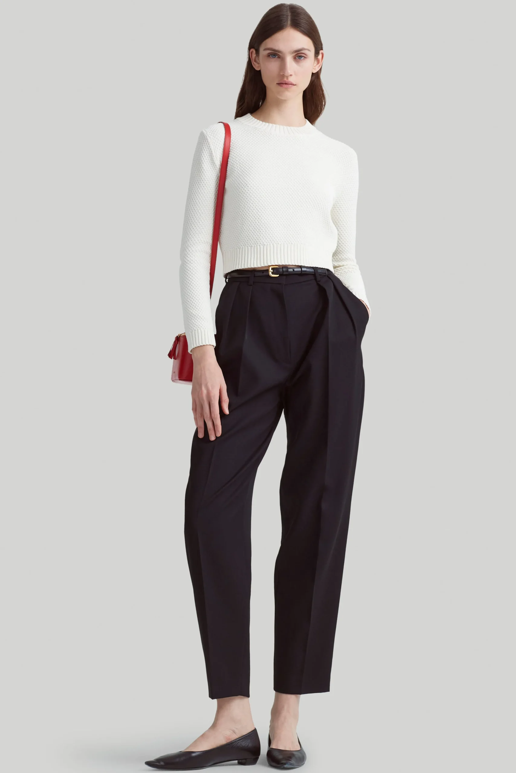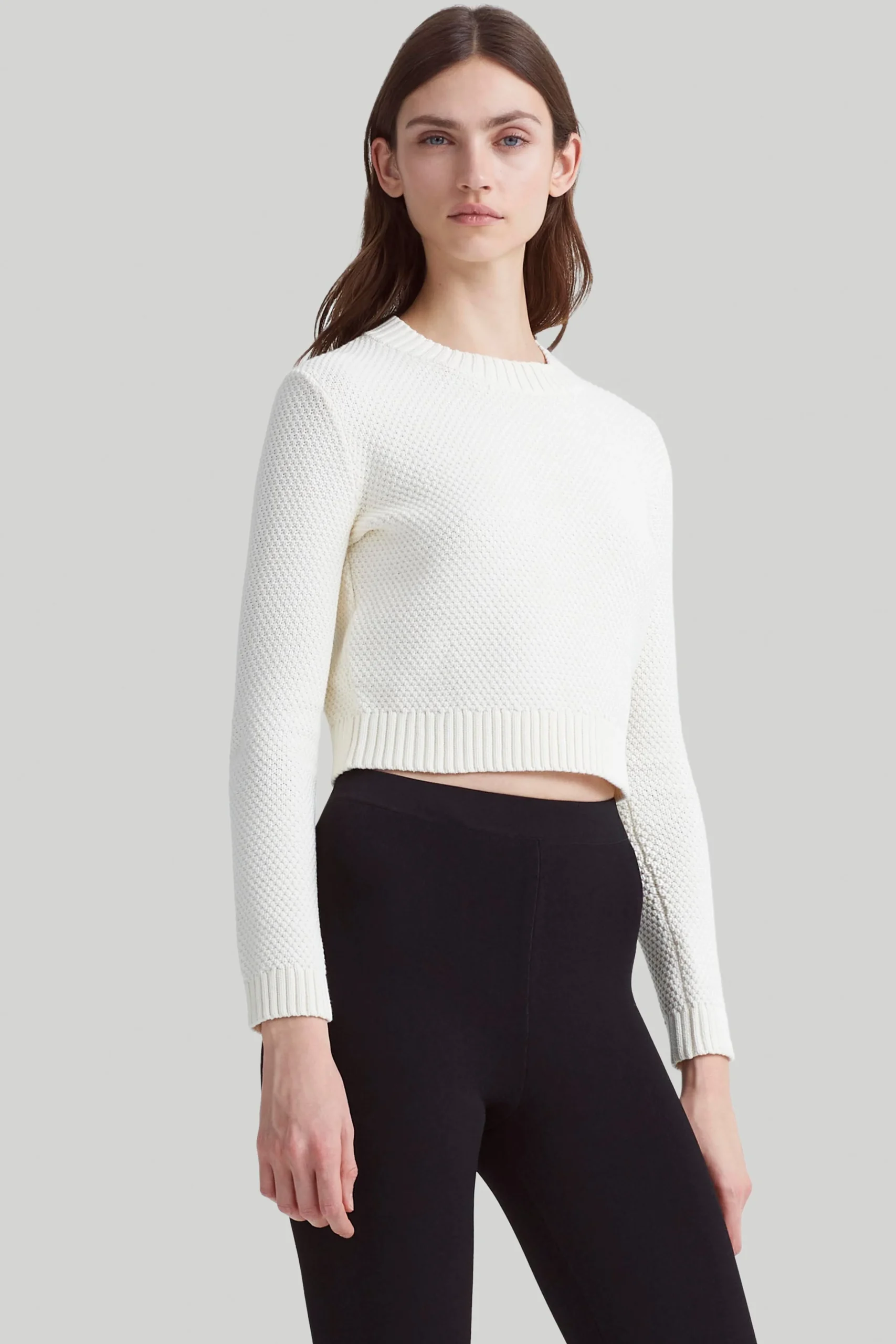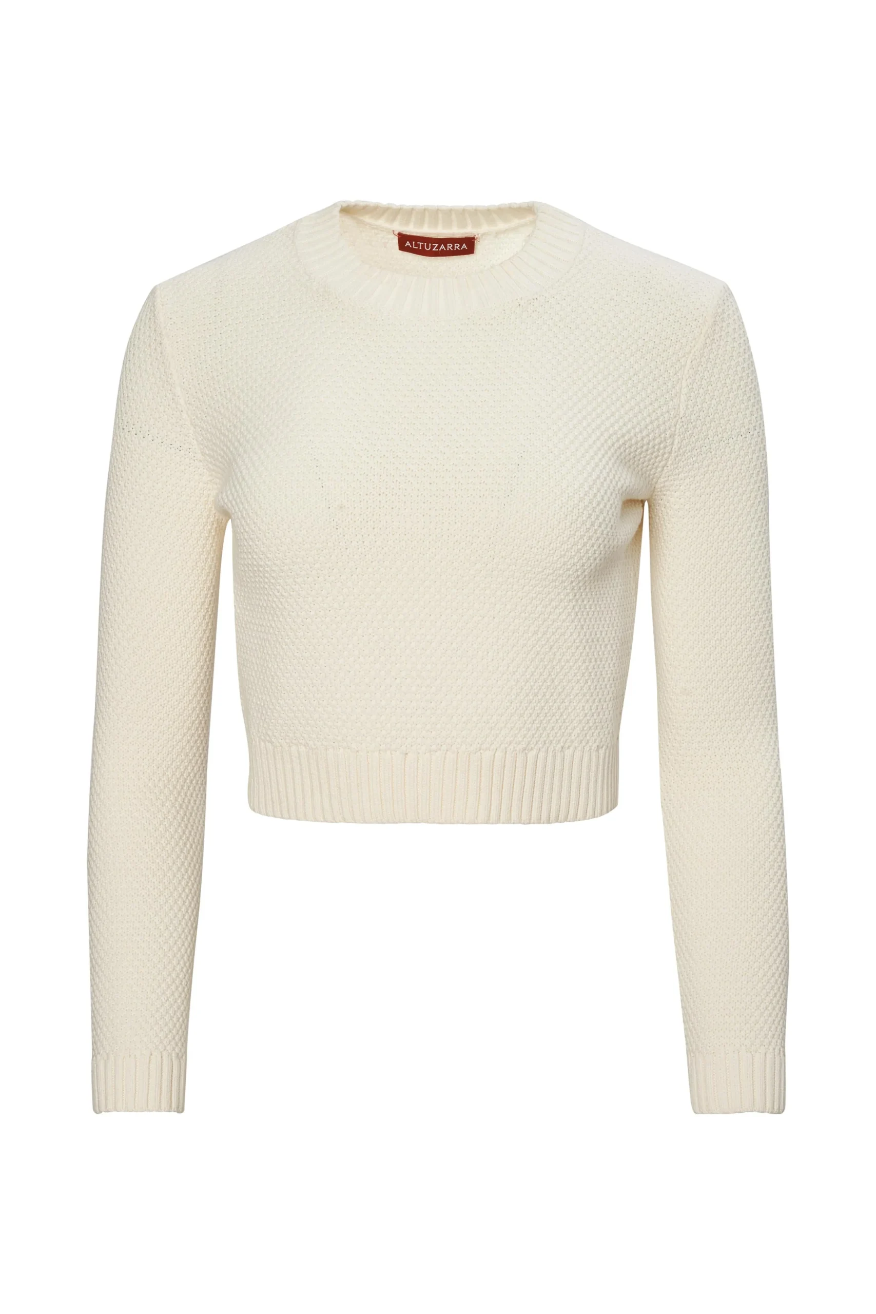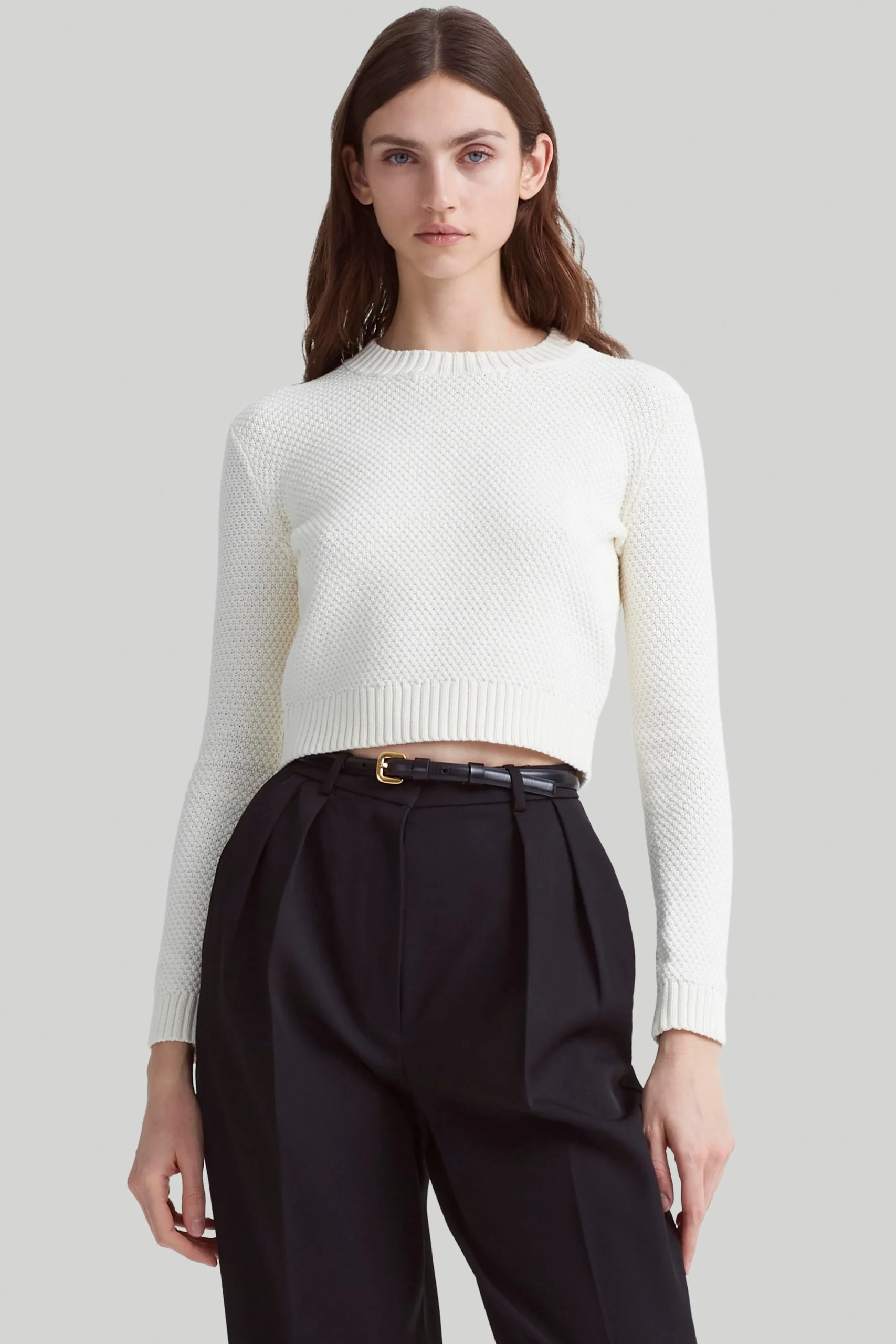The ‘Pogo’ sweater is a wardrobe staple, knitted from a soft cotton-blend with a textured weave. The shrunken design is finished with a ribbed collar, cuffs and hem.
